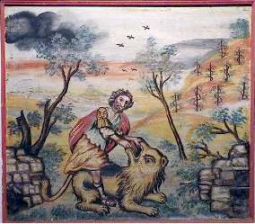 Simson ging mit seinen Eltern hinab gen Thimnath und als sie kamen an die Weinberge zu Thimnath, siehe da kam ein junger Löwe brüllend ihm entgegen. Und der Geist des Herren geriet über ihn, und zerrisse ihn, wie man ein Böcklein zerreißt, und hatte doch gar nichts zur Hand, und sagets nichts an seinem Vater noch seiner Mutter. (Im Buch der Richter 14,5-6).