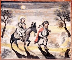 Da die Weisen hinweg gezogen waren, siehe, da erschien der Engel des Herrn dem Joseph im Traum, und sprach: Stehe auf und nimm das Kindlein und seine Mutter zu dir, und fleuch in Ägyptenland und bleib all da bis ich dir sage. Denn es ist fürhanden daß Herodes das Kindlein sucht, dasselbe umzubringen. Und er stand auf, und nahm das Kindlein und seine Mutter zu sich bei der Nacht, und entwich in Ägyptenland, und blieb all da bis nach dem Tode Herodis. (Matthäus 2,1-14).