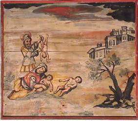 Da Herodes nun sah, daß er von den Weisen betrogen war, ward er sehr zornig, und schickte aus, und ließ alle Kinder zu Bethlehem töten, und an ihren ganzen Grenzen, die da zweijährig und darunter waren, nach der Zeit die er mit Fleiß von den Weisen erlernt hatte.