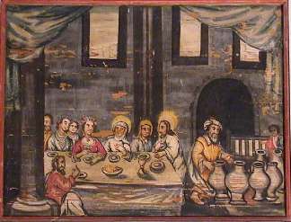 Und am dritten Tage war eine Hochzeit zu Kana in Galiläa, und die Mutter Jesu war da. Jesus und seine Jünger wurden mit auf die Hochzeit geladen. Und da es an Wein gebrach, spricht die Mutter Jesu zu ihm: Sie haben nicht Wein . Jesus spricht zu ihr: Weib, was hab ich mit der zuschaffen. Meine Stunde ist noch nicht gekommen. Seine Mutter spricht zu den Dienern. Was er euch sagt das tut. Es waren aber sechs steinerne Wasserkrüge gesetzt, nach der Weise der jüdischen Reinigung, u. gingen je in einen zwei oder drei Maaß. Und er spricht zu ihnen. Füllet die Wasserkrüge mit Wasser, u. sie füllten sie bis oben an. (Johannes z, 1-7).