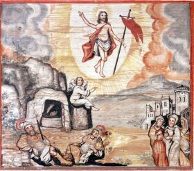Die Weiber gingen hinein in das Grab, und sahen einen Jüngling zur rechten Hand sitzen, der hatte ein lang weiß Kleid an und sie entsetzten sich. Er aber sprach zu Ihnen: Entsetzet euch nicht.Ihr suchet Jesus von Nazareth ,den gekreuzigten? Er ist nicht hier. Er ist auferstanden .Siehe da die Stätte, da sie ihn hinlegten. Gehet aber hin, und sagets seinen Jüngern und Petrus, daß er vor euch hingehen wird in Galliläa; da werdet ihr ihn sehen, wie er euch gesagt hat. (Markus 16,5-7).